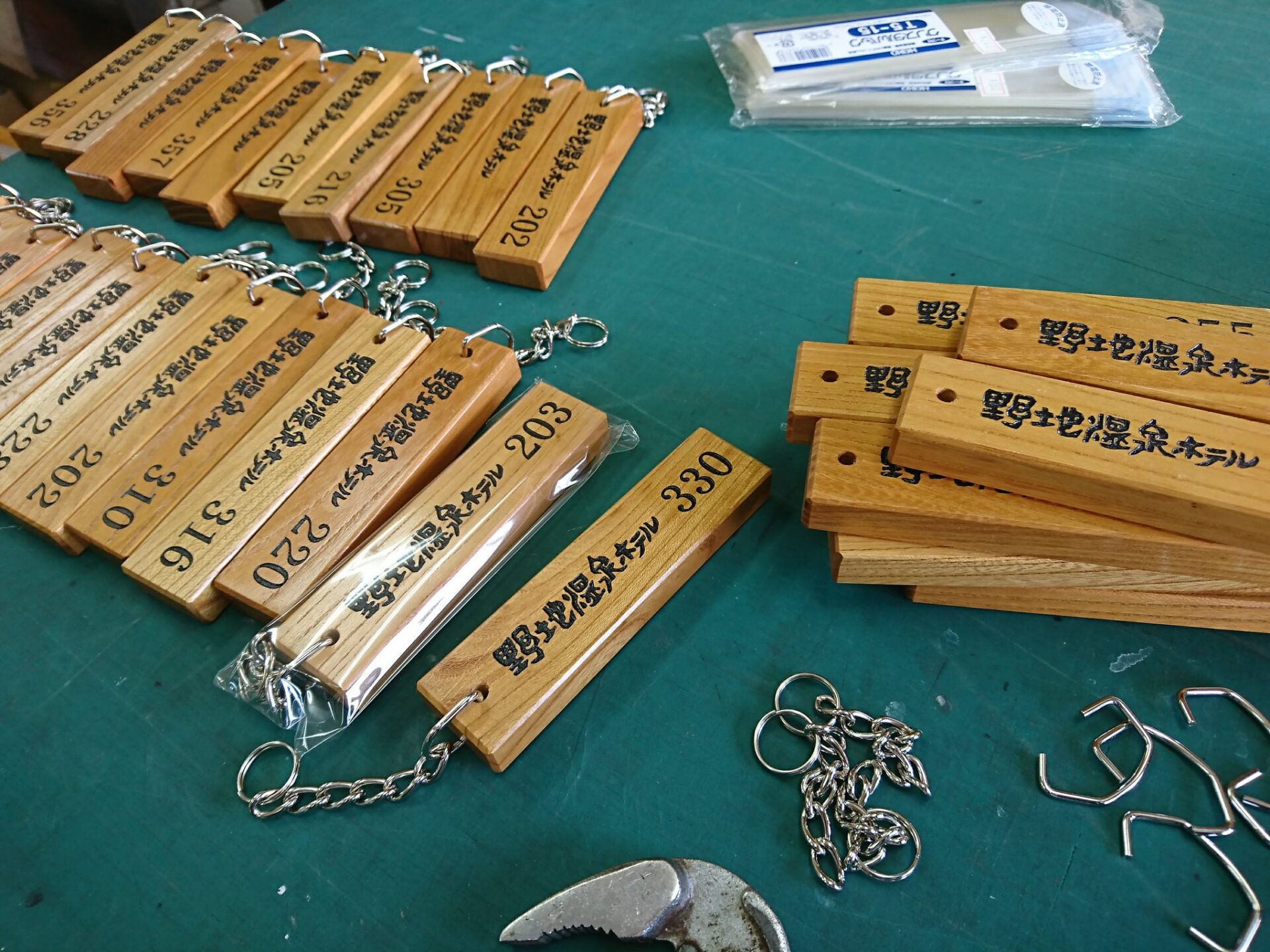 野地温泉ホテル様のお部屋の木製ホルダーです。ロゴマークをレーザー彫刻で加工し、黒塗装を行いました。お部屋に合わせた番号も記載し、木の風合いを生かしたキーホルダーとなります。