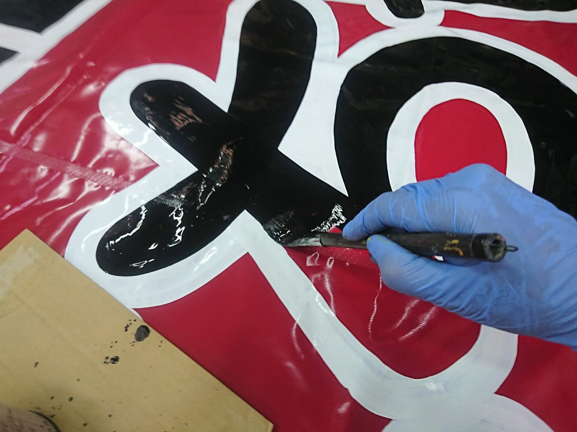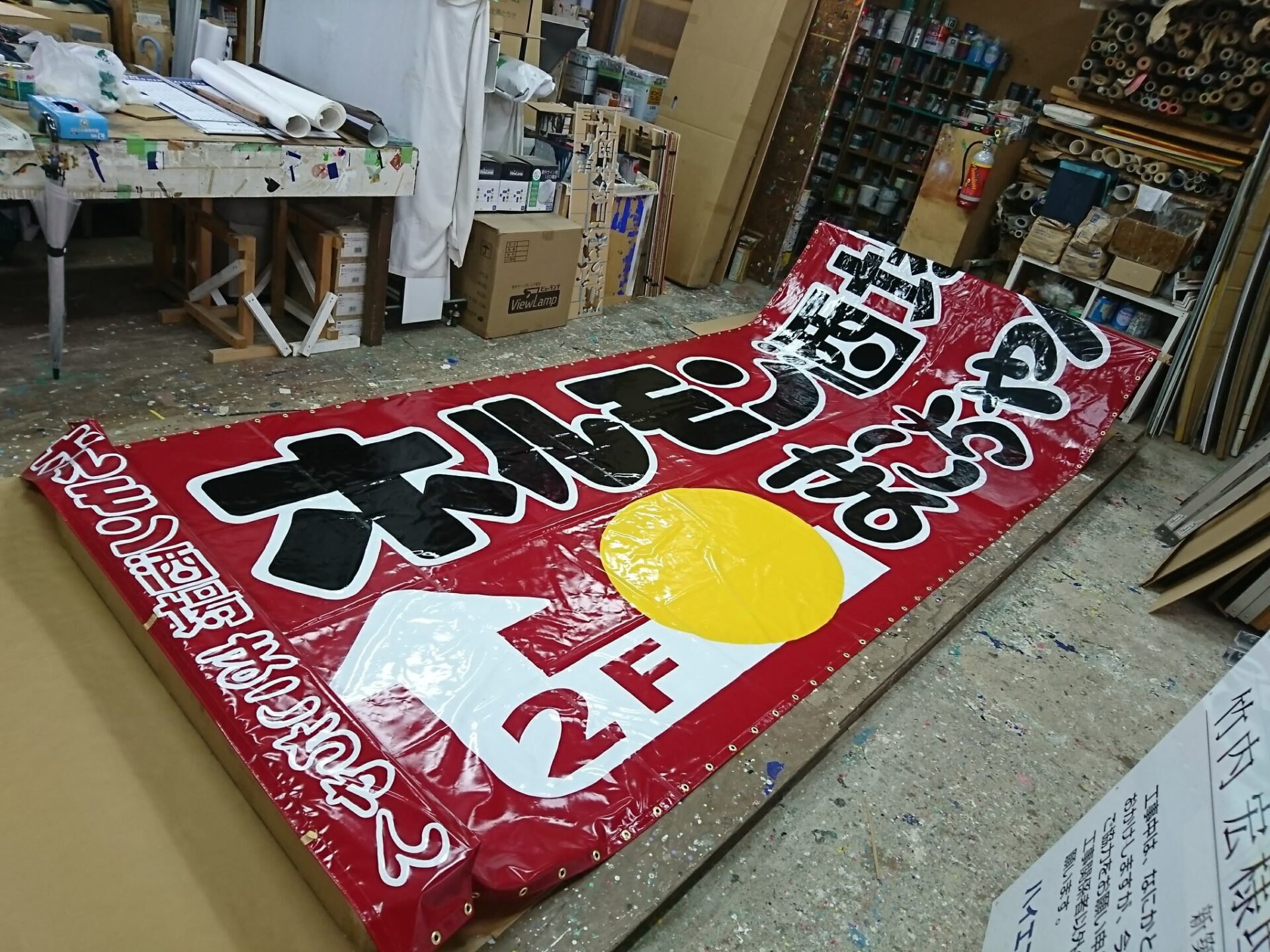 福島駅前にあるホルモン酒場まこちゃんの店舗横断幕看板を制作いたしました。文字の部分は、出力印字ではなく手書きになります。ホルモン屋さんの雰囲気に合わせた大衆焼肉屋さんのイメージを表現しました。
